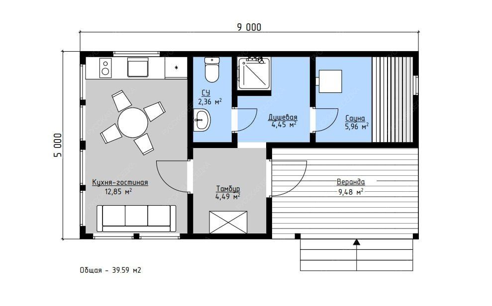 Баня «Кленовая» размером 9х5 метров с двухскатной крышей предлагает продуманную планировку общей площадью 39,59 кв.м. Центральным элементом архитектуры выступает панорамное остекление в зоне отдыха, наполняющее интерьер естественным светом и обеспечивающее визуальную связь с окружающим ландшафтом. Двухскатная кровля придает строению классический, завершенный облик и надежно защищает от атмосферных осадков.