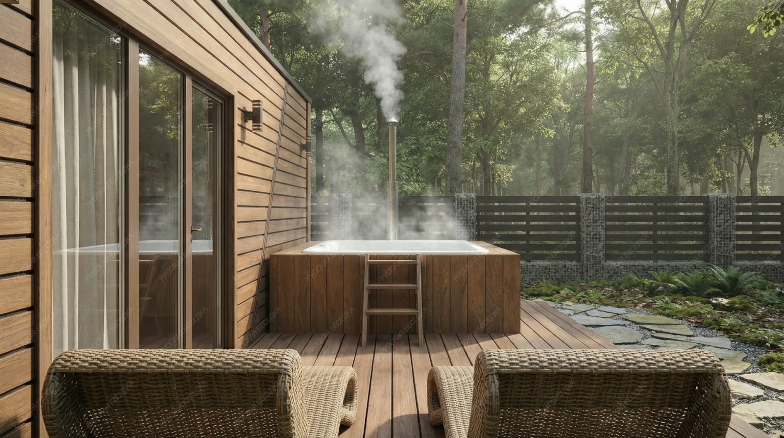 Огнебиозащита (бесцветная) или декоративный деревозащитный состав "Здоровый дом" (цвет на выбор) – нижняя обвязка, лаги, пол и цокольная доска.
