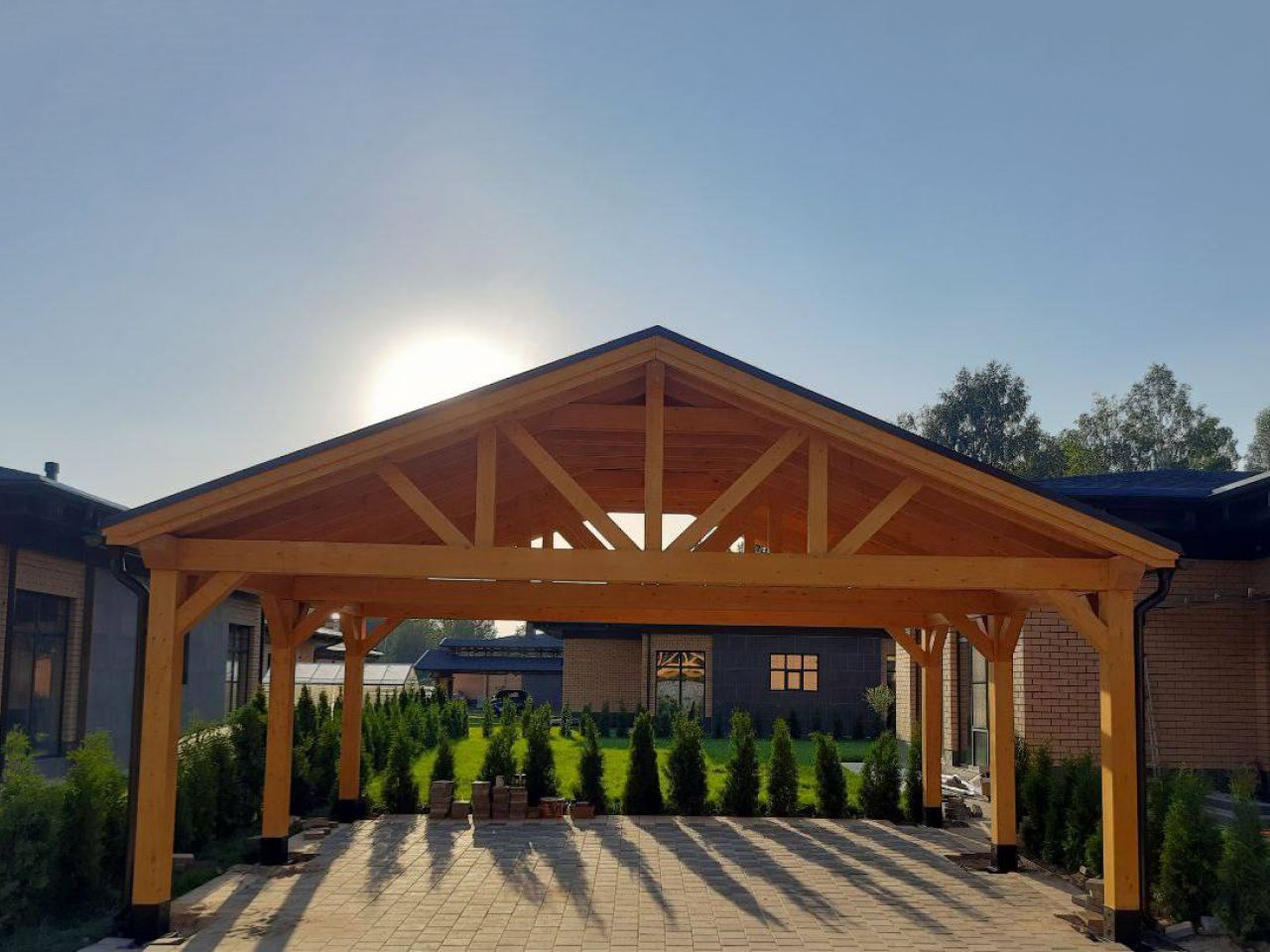 Навес из дерева послужит отличным парковочным местом для одного или нескольких автомобилей.