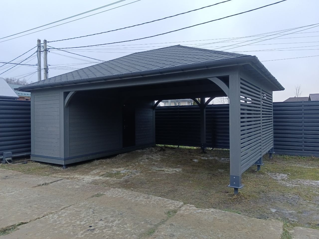 Навес из дерева послужит отличным парковочным местом для одного или нескольких автомобилей.
