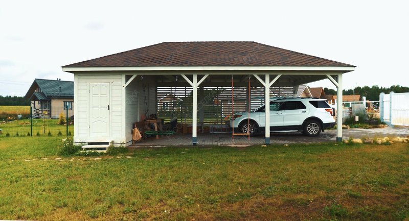 Навес из дерева послужит отличным парковочным местом для одного или нескольких автомобилей.