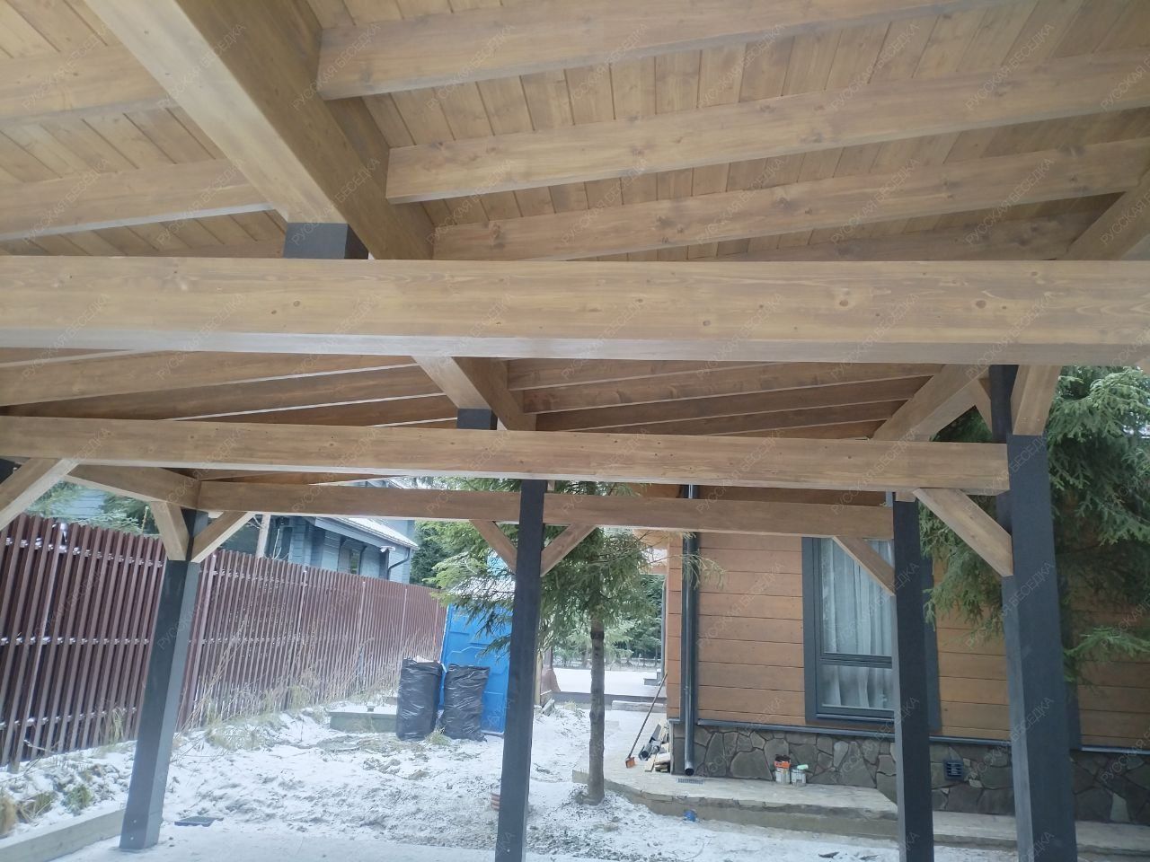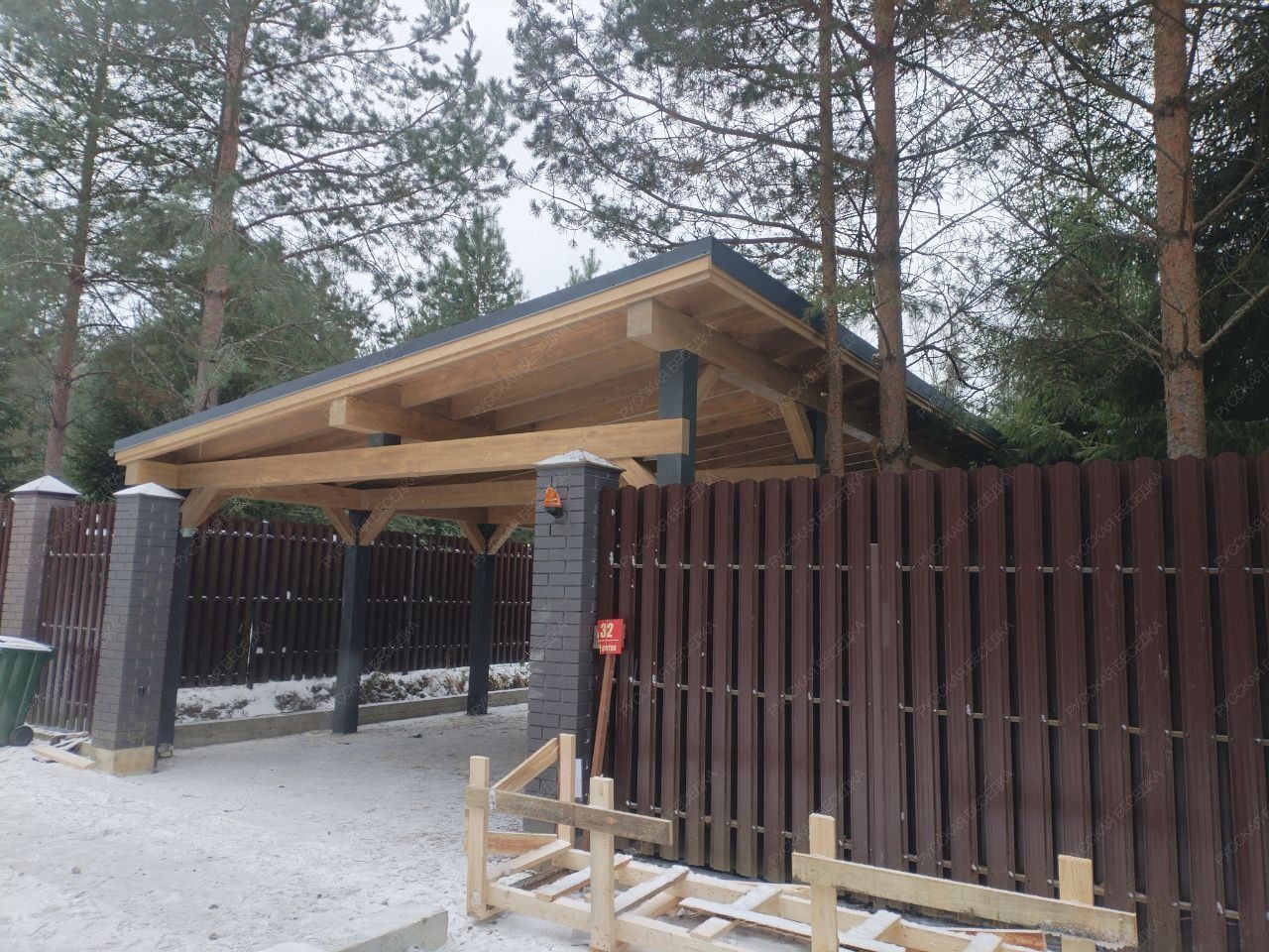 Для производства всех элементов навеса используется только отборная древесина без малейших дефектов, прошедшая камерную сушку и пропитку антисептиками. Навесу после защитной обработки лаком не страшны высокая влажность, а значит, можно быть уверенным, что дерево не растрескается, не разбухнет и не покоробится.