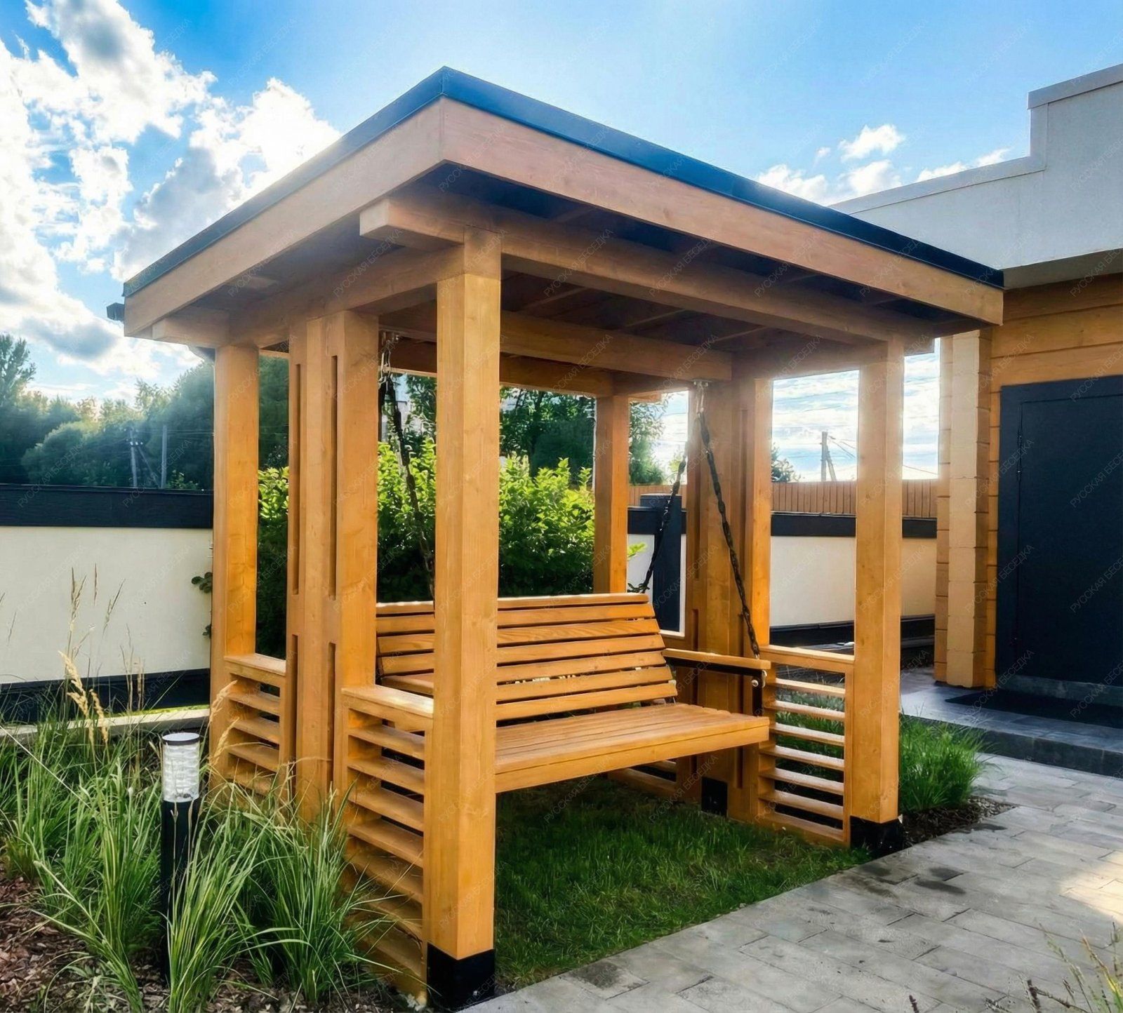 Пергола с навесом обеспечивает надежную защиту от солнечных лучей, создавая тенистое пространство для отдыха. Она станет идеальным местом для встреч с друзьями, чтения книг или приема пищи на свежем воздухе.