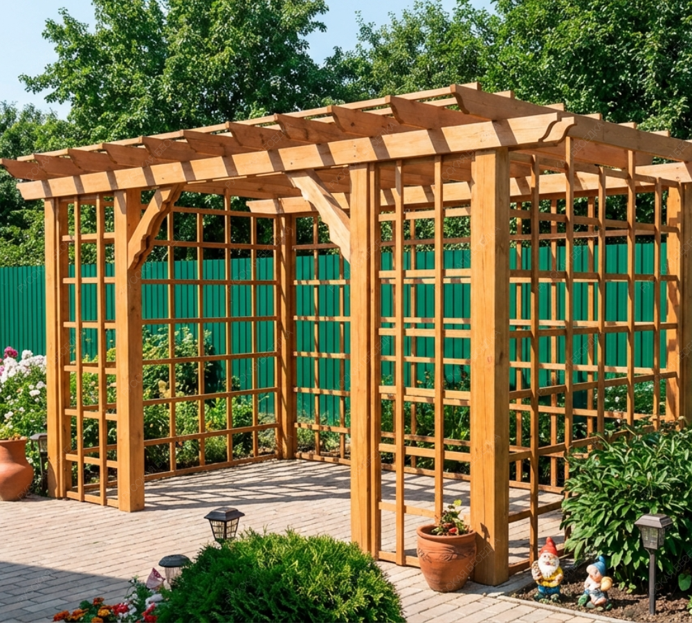 Пергола с навесом обеспечивает надежную защиту от солнечных лучей, создавая тенистое пространство для отдыха. Она станет идеальным местом для встреч с друзьями, чтения книг или приема пищи на свежем воздухе.